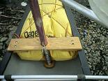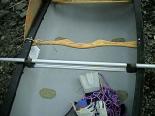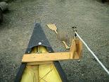 アウトリガーの取り付け状態。 少し太めのアルミパイプを艇の幅に切ったものと1.8Mも2本を、マジックテープ+プラスチックバックル(銀マットなどの締め付け用に売っているもの)で少しきつく束ねてとめてあります。 これなら、取り付け取り外しも簡単で、しかも強度が十分に得られます。 |