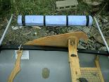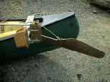 ラダーの取り付け状態。 ガンネルの上下を2枚の板ではさみ、蝶ナットで締め付けています。 本当なら艇の最後部につけるのが良いのですが、取り付けのために艇を加工しないといけないので、この取り付け方法にしました。 アルミポールで舵取りをします。 |