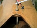 マストの取り付け部分 デッキを裏から補強して穴をあけ、ゴム製のスリーブをつけています マストのフットは木片を加工してタープポールがすっぽりはまり込むサイズの穴をあけ、ボトムにエポキシで接着してあります |