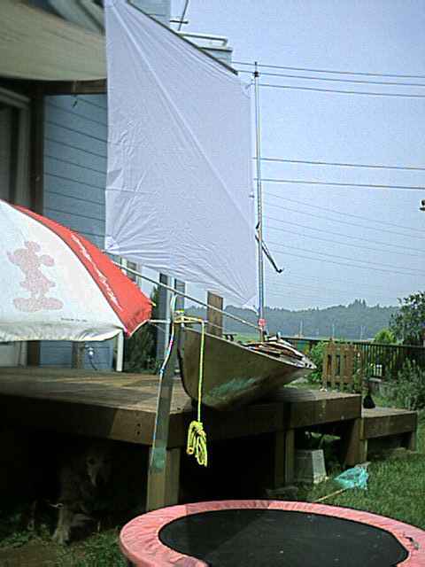 セールの上部他端をアルミポールで持ち上げてセールを張っています