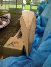 ボトム板の合わせ目5mmほどのところみ1mm程度の穴をあけ、銅線でくくっていきます サイドもバウとスターンを銅線でくくっていきます 縫い合わせたサイド板を中央で開いて、ボトム板をのせ、同様に銅線でくくっていきます |
