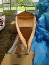 艇の形を整えるために設計図かたとった断面に相当する合板をはめこみ様子をみる |